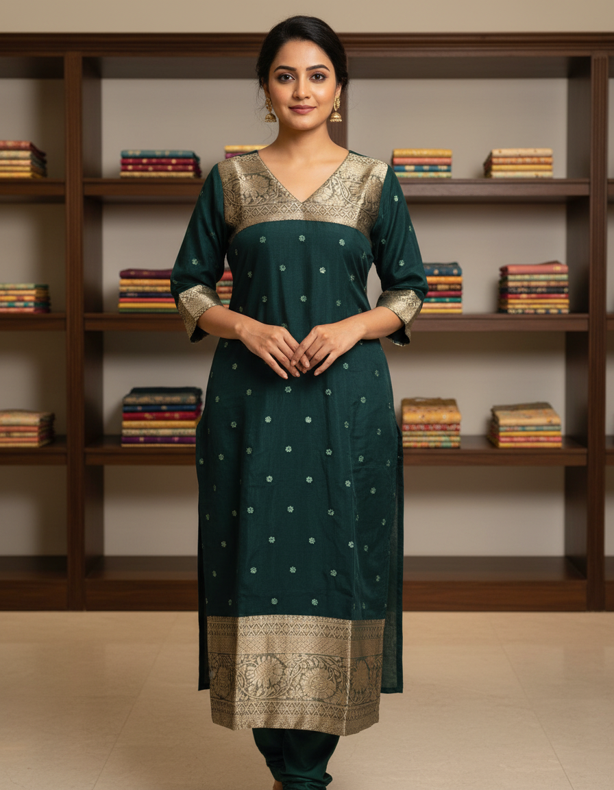 Bottle Green Banarasi Silk Kurta with Antique Gold Zari Border for Women