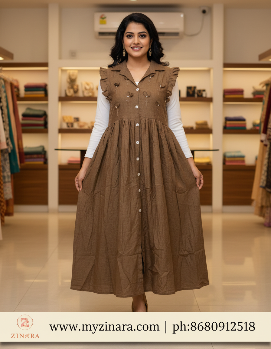 Crafted in a rich cedar brown tone, this dress brings warmth and versatility to your wardrobe. The delicate ruffle sleeves add a touch of feminine charm, while the button-down front offers both style and functionality. Whether you’re heading out for a casual day, a brunch date, or a festive gathering, this dress ensures you stand out with minimal effort.