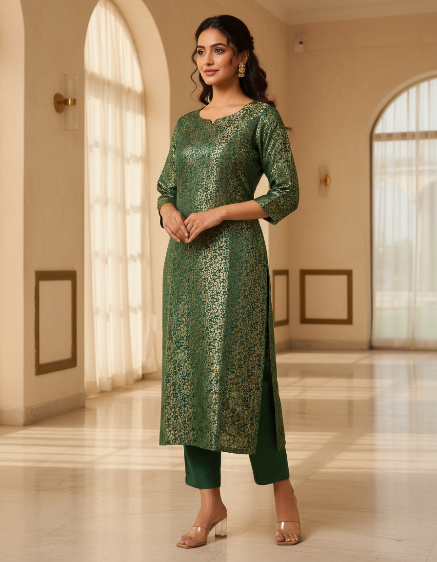 Step into luxury with this stunning emerald green brocade kurti, designed to reflect timeless elegance and regal charm. The rich emerald shade combined with intricate brocade weaving creates a sophisticated and eye-catching look.