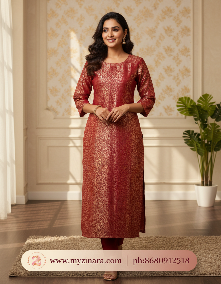 Step into timeless elegance with this Emerald Red Brocade Kurti from Zinara – a perfect blend of royal charm and festive sophistication. Designed for special occasions, this kurti showcases rich brocade fabric with intricate woven patterns that reflect luxury and tradition.