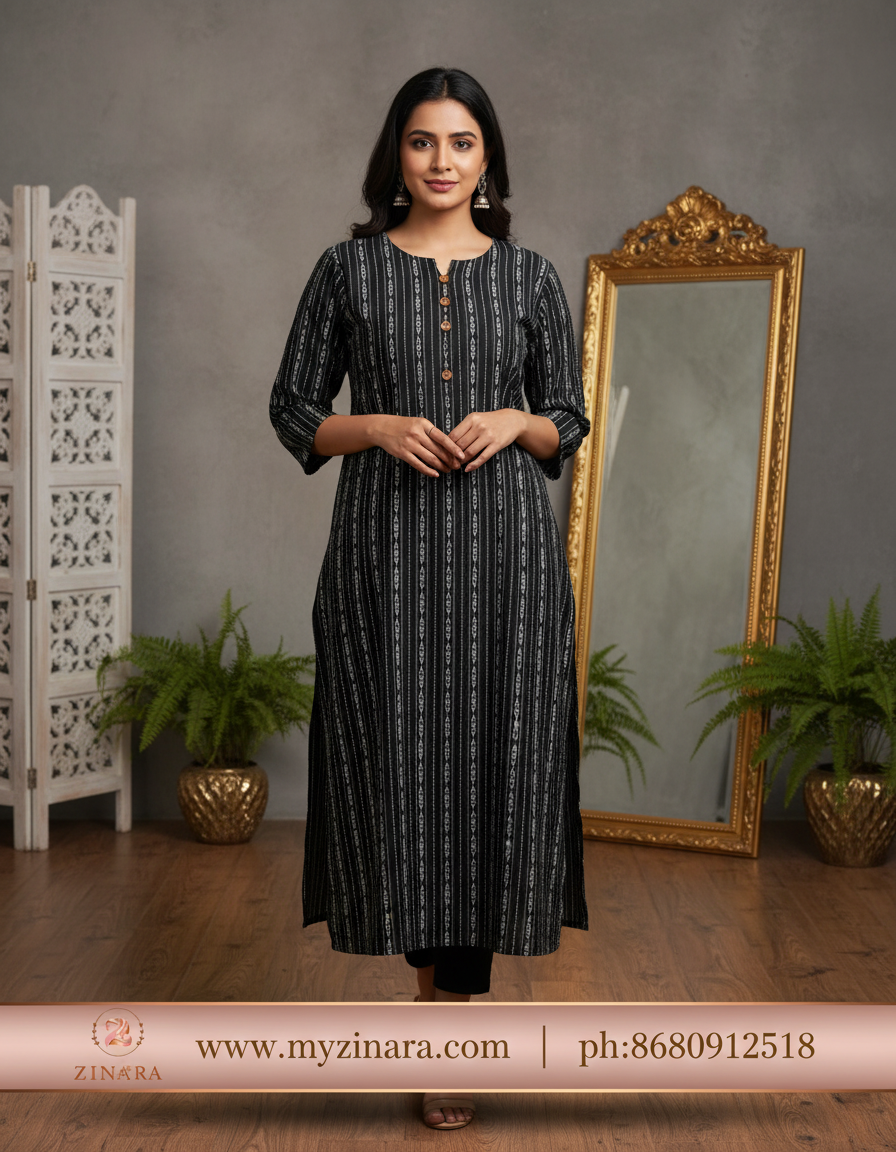 Make a striking style statement with this ink black stripe Ikat kurti, designed for a bold and contemporary ethnic look. The deep black base combined with classic Ikat stripe patterns creates a perfect blend of tradition and modern design.