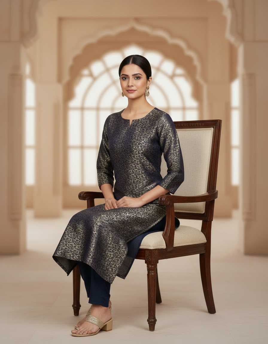 Navy Silk Full Banarasi Royale Kurti with Side Slit