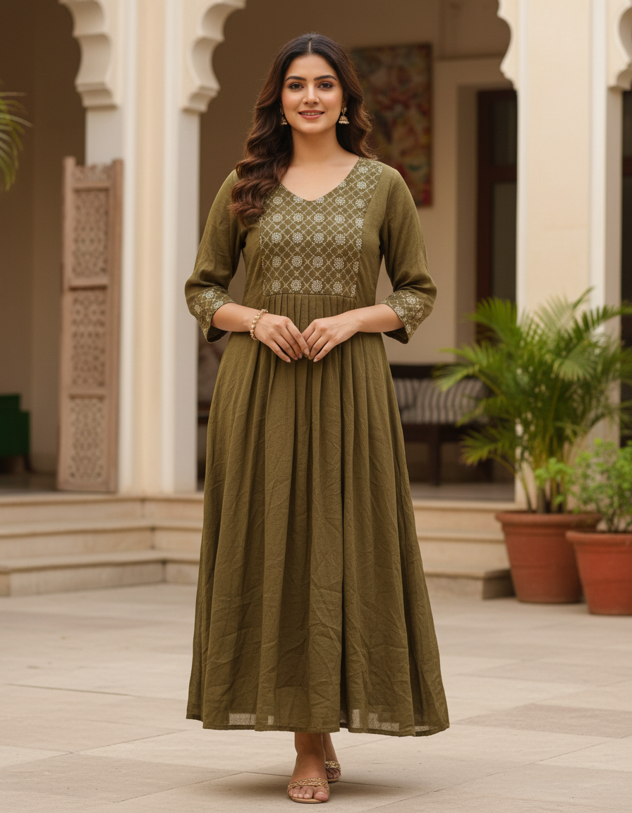 Step into elegance with this luxurious olive green A-line kurti, crafted from premium viscose fabric for a smooth and graceful drape. The rich olive tone combined with subtle cosmos-inspired patterns creates a refined and sophisticated look.