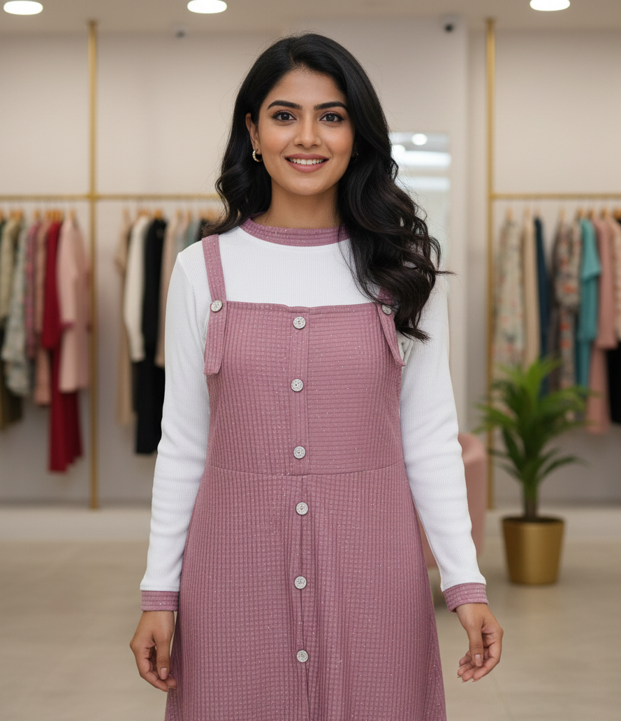 Upgrade your everyday style with this elegant Pinafore Style Layered Dress, designed for modern women who love effortless fashion. This chic outfit features a classic black A-line pinafore layered over a soft full-sleeve inner top, creating a timeless and versatile look perfect for any occasion.