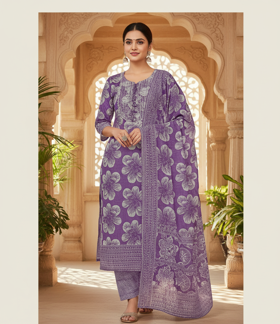 Made from pure cotton, this outfit is breathable, soft on the skin, and perfect for all-day wear. The delicate floral prints on a soothing lavender base create a calm and refreshing aesthetic, making it ideal for everyday wear, office styling, or casual outings.