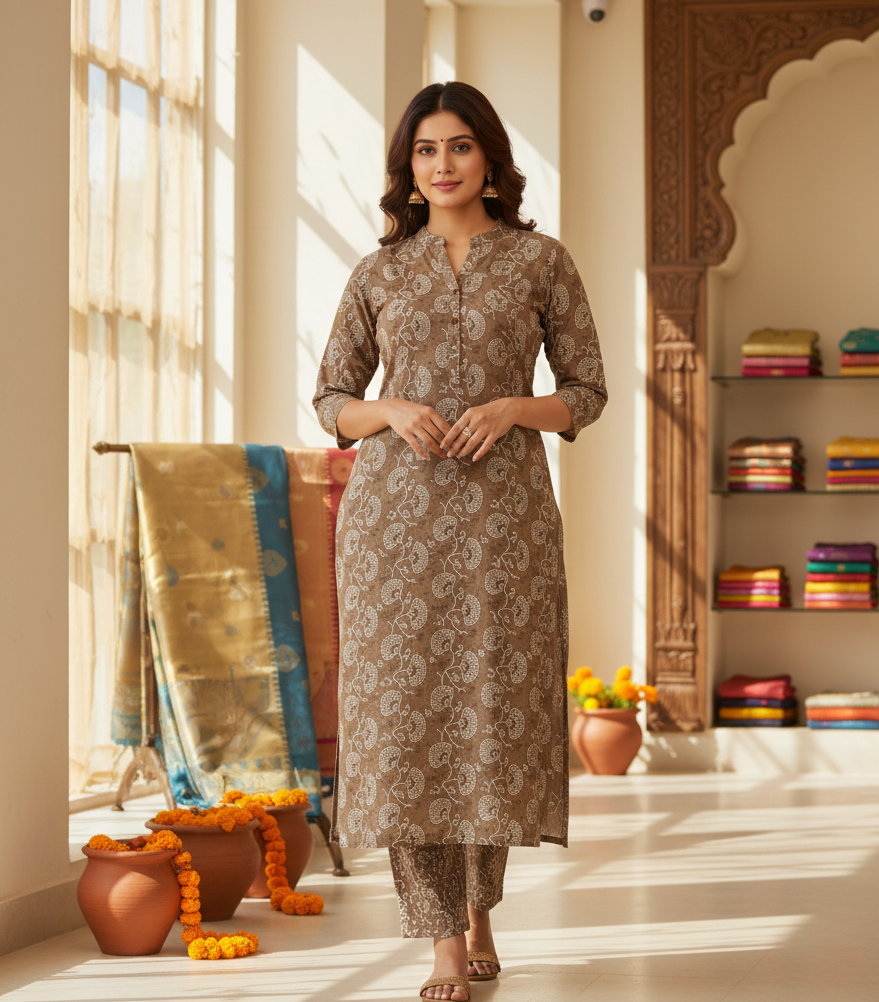 Keep it effortlessly elegant with this Sandal Color Pure Cotton Long Co-Ord Set from Zinara – where comfort meets minimal style. Designed for modern women who prefer subtle sophistication, this co-ord set features a soothing sandal shade with a clean and refined look.