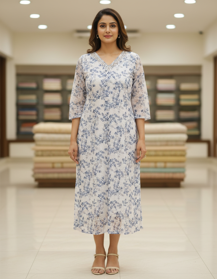Add a fresh and vibrant touch to your ethnic wardrobe with this elegant white and blue blossom kurti. Designed with a flattering V-neck, this kurti features beautiful floral patterns that create a soft and graceful look.