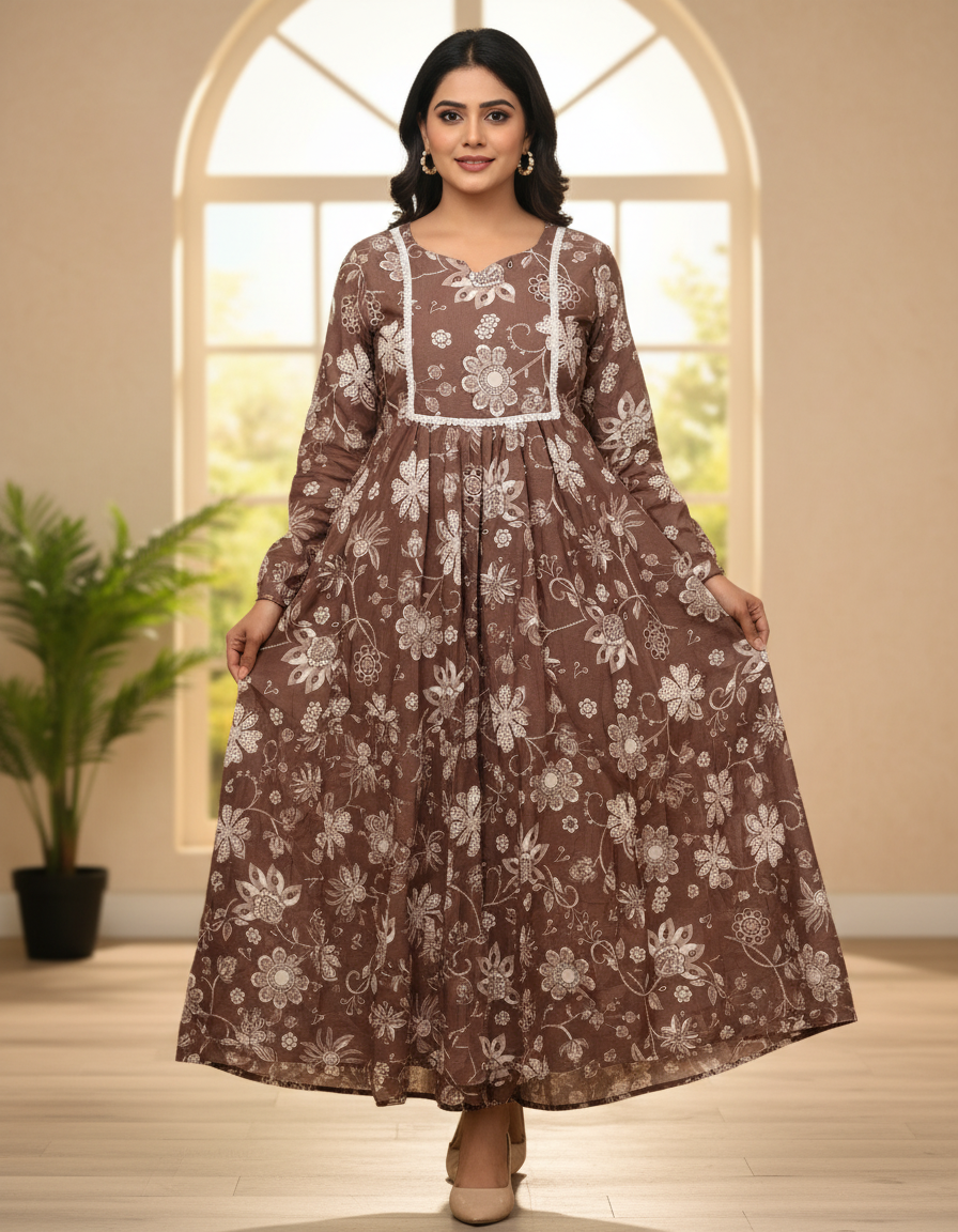 Step into graceful elegance with this Coffee Brown Floral Anarkali Dress, beautifully designed with a delicate white lace border and yoke detailing. The soft, breathable fabric combined with a flowy silhouette creates a flattering and comfortable fit for all-day wear.