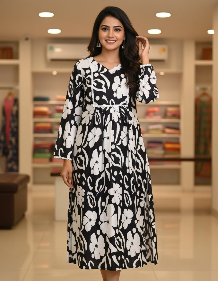 Step into timeless elegance with this beautifully crafted black and white floral Anarkali dress. Designed to blend tradition with modern charm, this outfit features a graceful silhouette that flatters every body type.